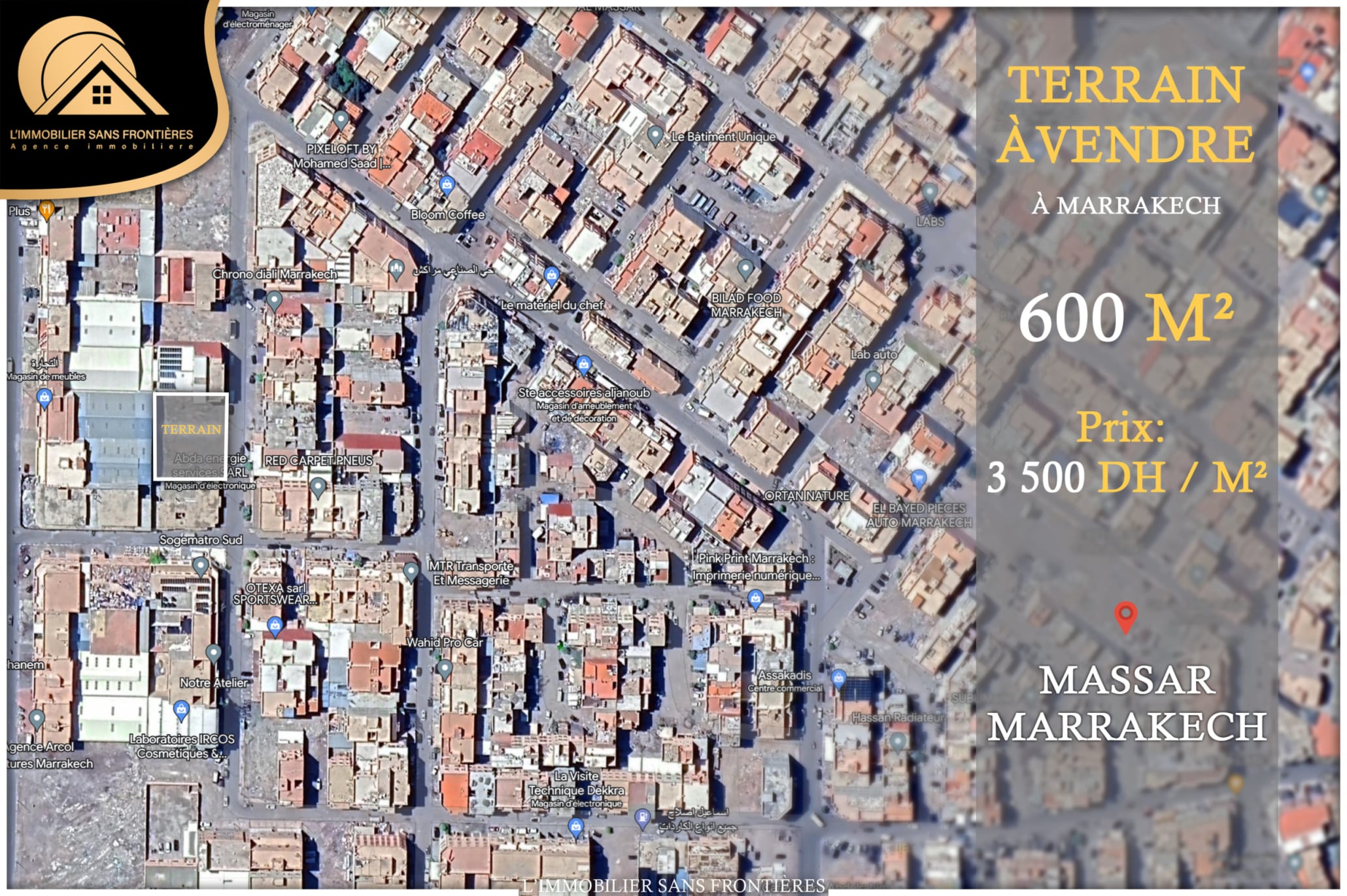 وكالة عقارات بلا حدود تعرض هذه الأرض للبيع بمساحة 600 متر مربع في حي المسار، مراكش، بالقرب من وسط المدينة حسب الإعلان. الموقع مذكور كيسهل الولوج إلى الخدمات.