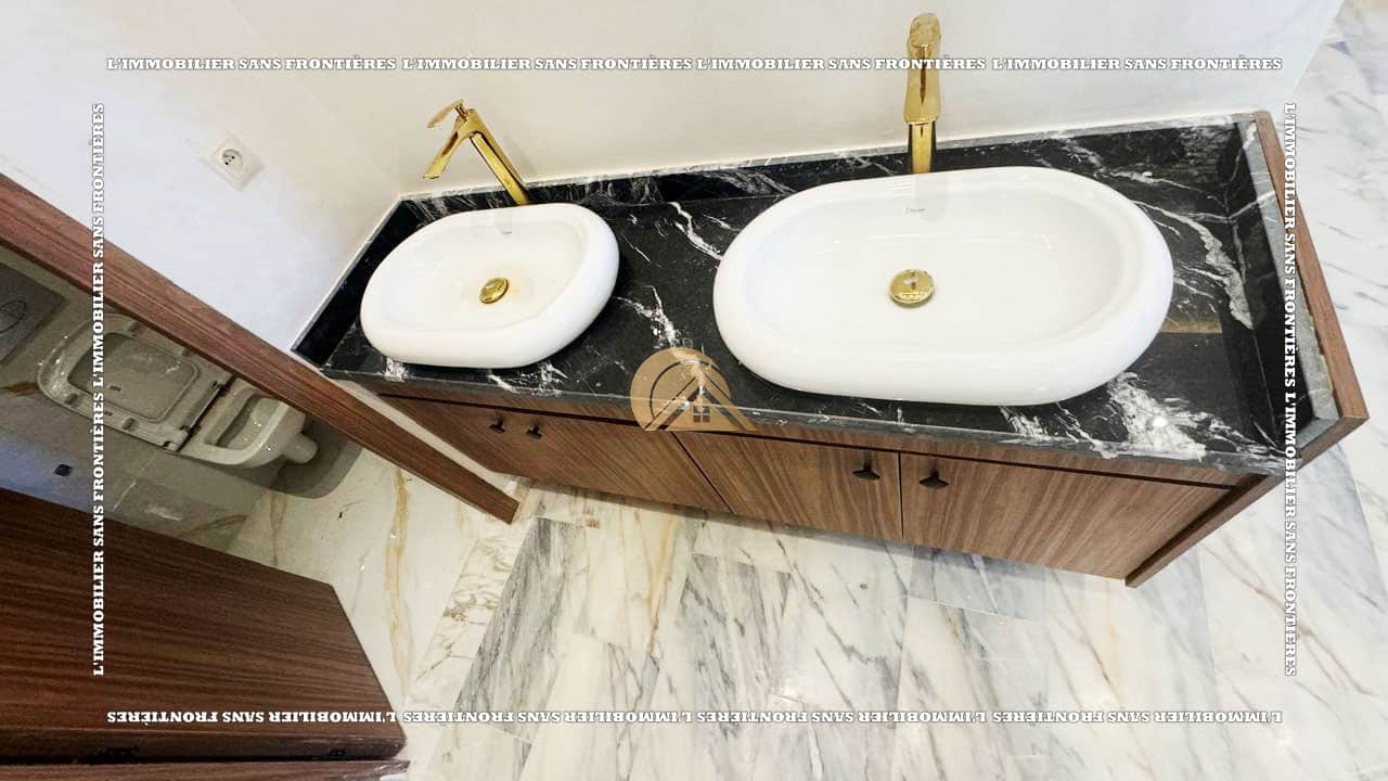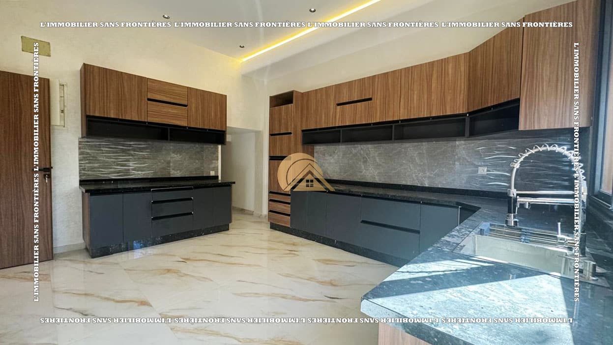 الطابق الأرضي: صالونان مضيئان مع نافذة زجاجية كبيرة مطلة على المسبح – إقامة واسعة – مرحاض للضيوف – مطبخ مجهز مع منفذ إلى التراس – غرفة – تراس